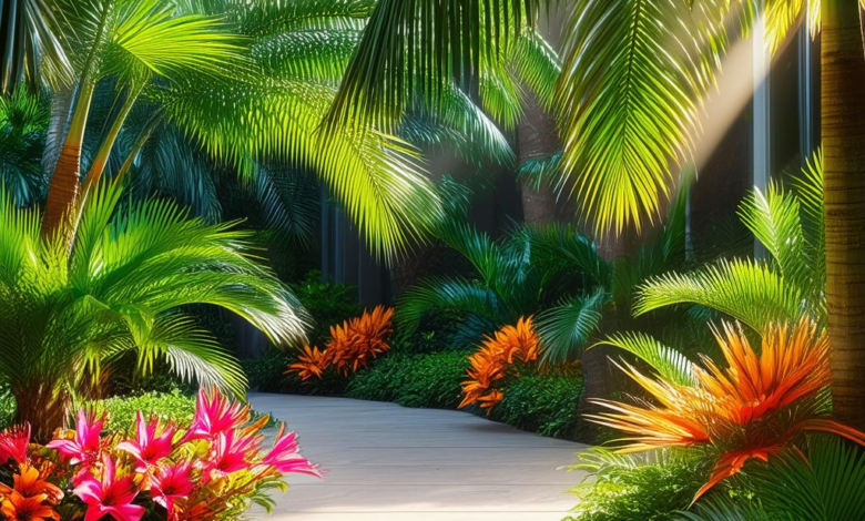 Ogrody tropikalne, pełne bujnych roślin i intensywnych kolorów, zyskają na wprowadzeniu egzotycznych palm jak królewska (Roystonea regia) czy kokosowa (Cocos nucifera), które wprowadzą tropikalny klimat.